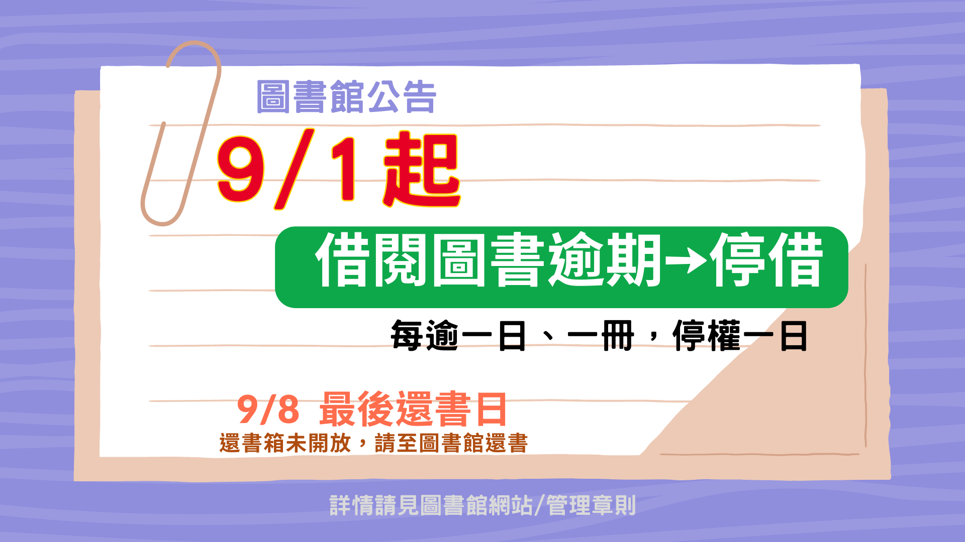 2025年6月27日新修訂之圖書館管理章則第八條規定,借閱圖書、期刊等逾期未還,應停止借閱圖書資料,每逾1日每冊罰停權借閱1日。若逾期超過180日,該資料視同遺失,依該書原定價賠償並罰停權借閱30日。
